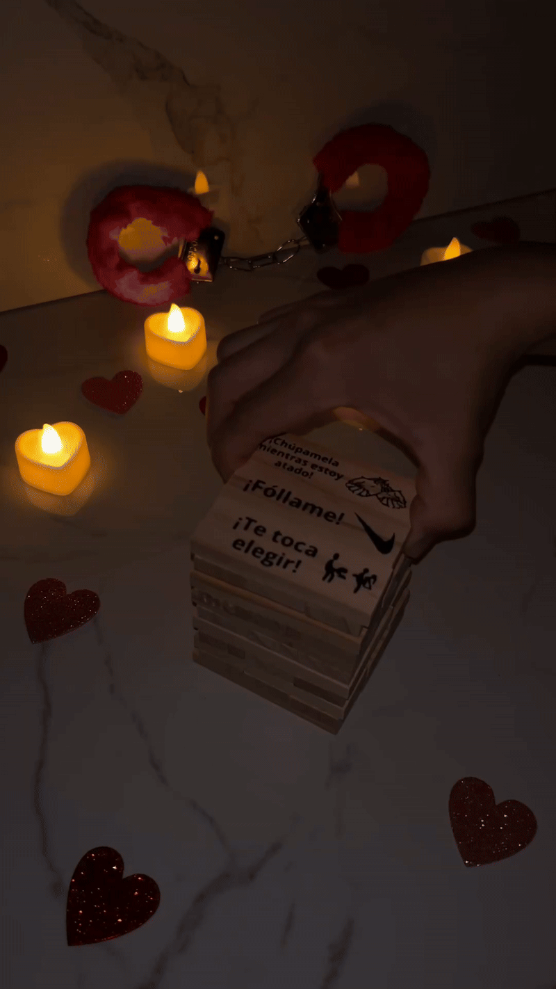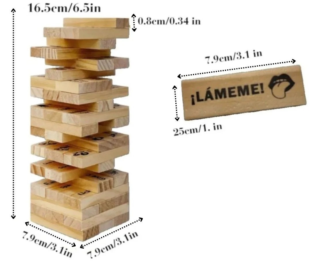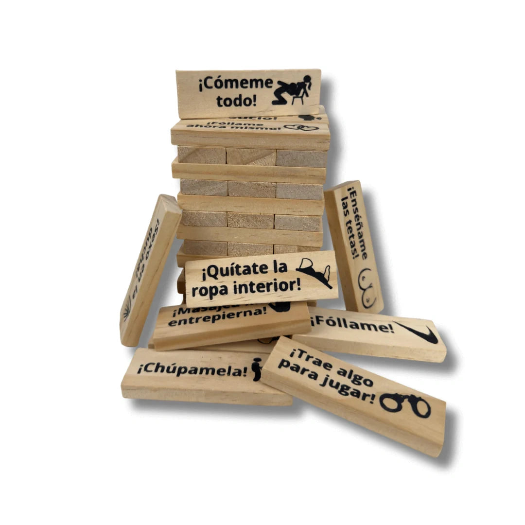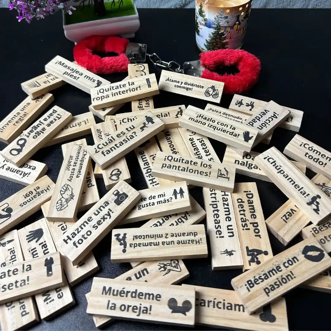 El juego incluye 20 o 48 fichas de madera (según la variante que elijas), cada una con un reto sexual distinto.