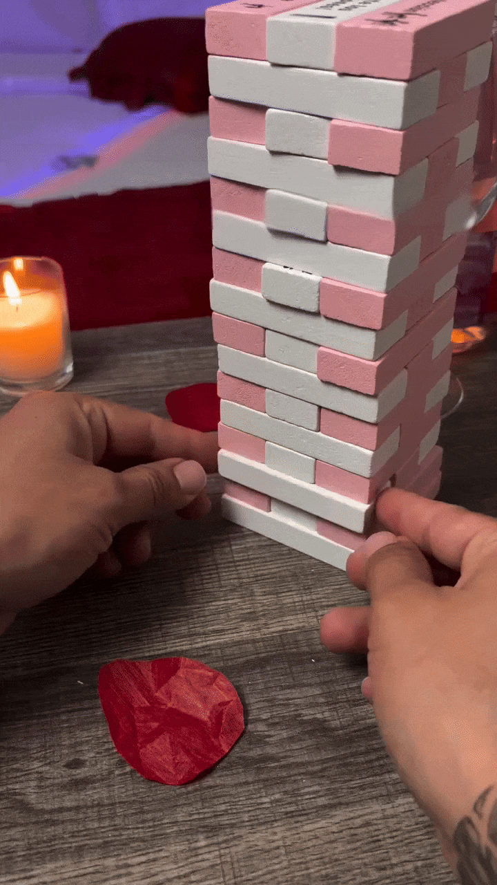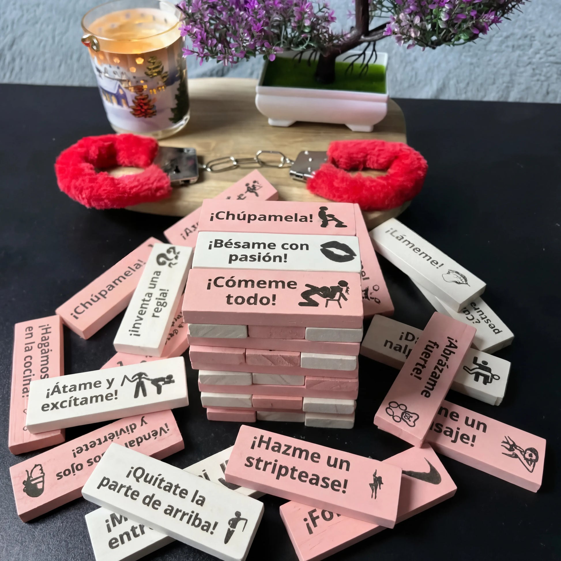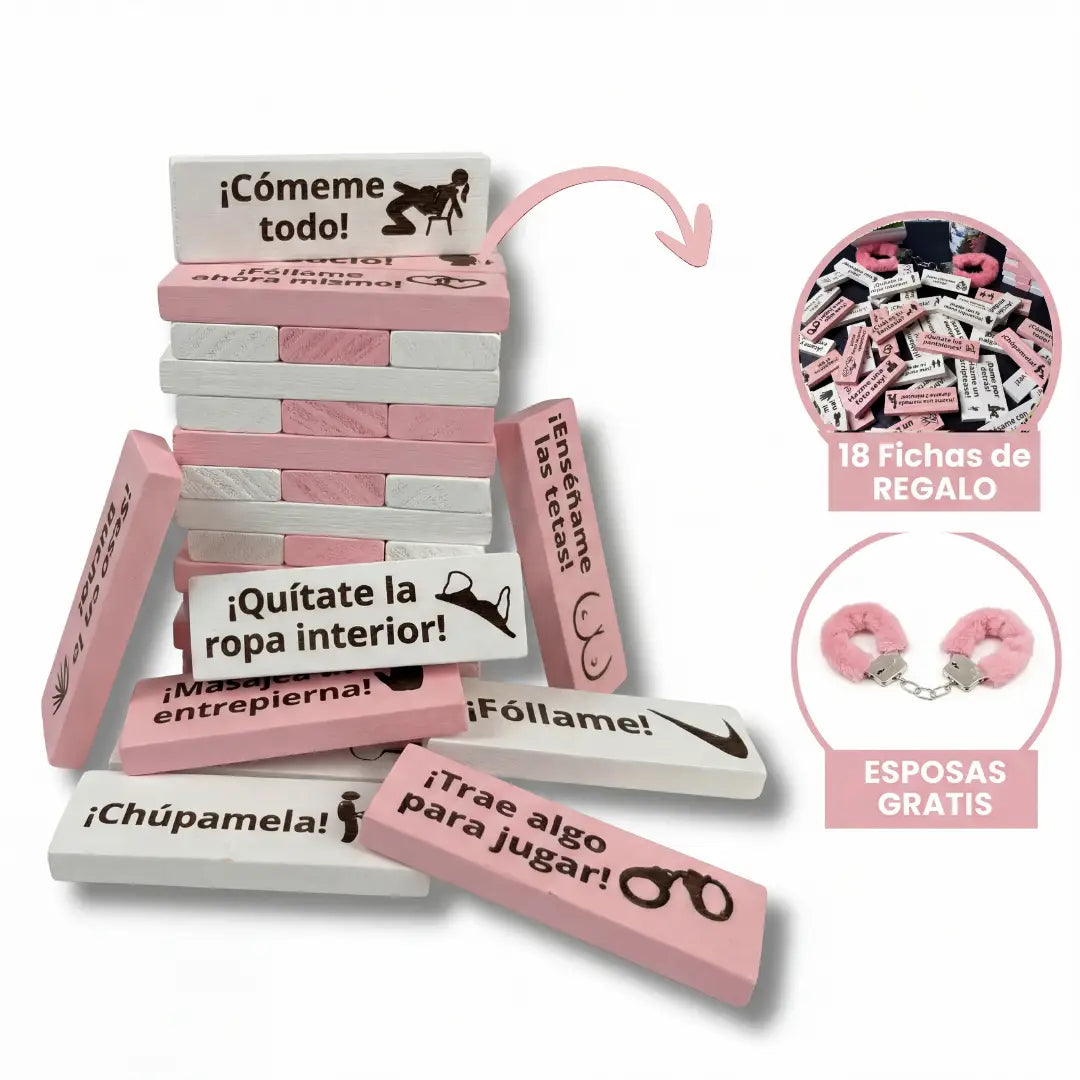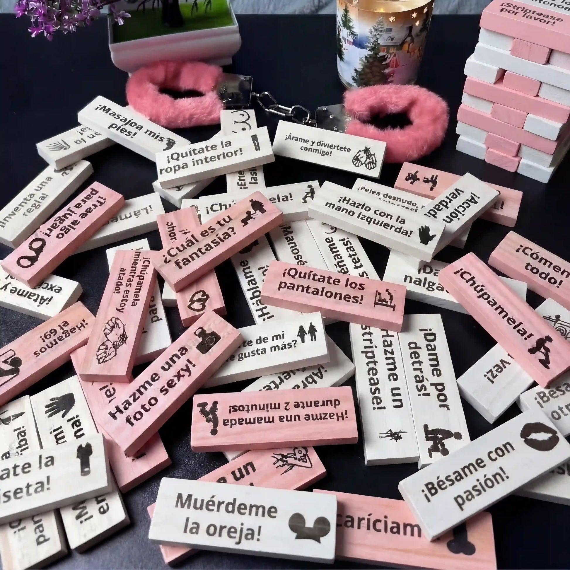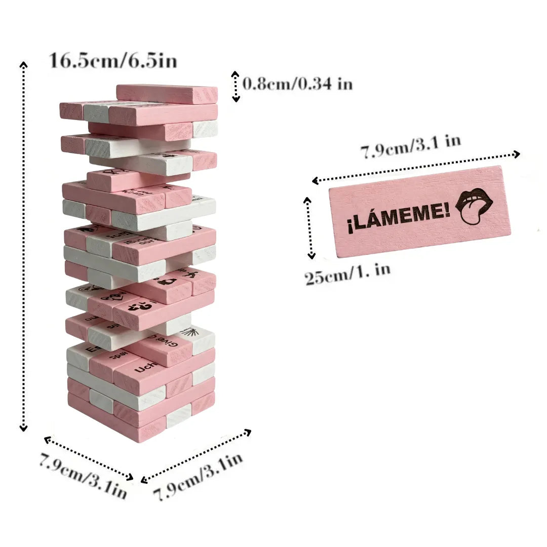 El juego incluye 20 o 48 fichas de madera (según la variante que elijas), cada una con un reto sexual distinto.